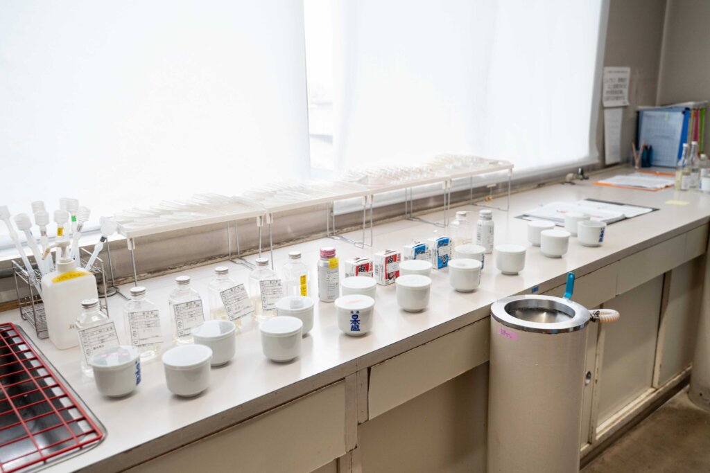 きき酒(ききざけ)は、人の五感を用いて日本酒の品質を判定することです。香りを嗅ぎ、そして口に含んで味や風味を確認します。この判定は、作られた日本酒が出荷になるかどうかを左右するとても大事な工程なんです。