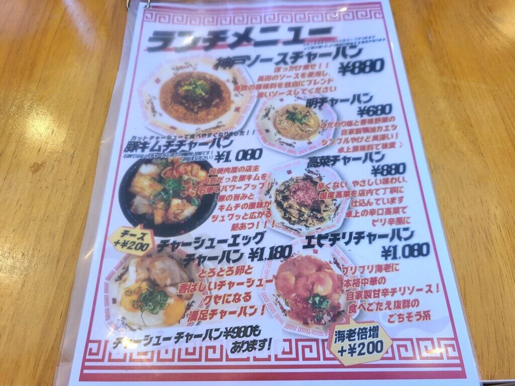 シンプルながら奥深い、基本の「明チャーハン」のほか、「神戸ソースチャーハン」や「チャーシューエッグチャーハン」など魅力的なメニューが並びます。どれもうまそう!