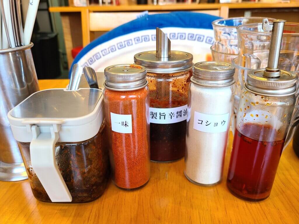 さらにテーブルには、紅生姜をはじめ、さまざまな調味料や薬味が用意されているので味変も楽しめます。