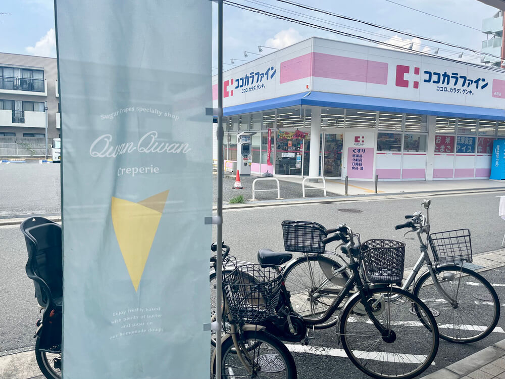 お向かいにあるドラッグストアと、クレープが描かれたのぼりが目印です。
