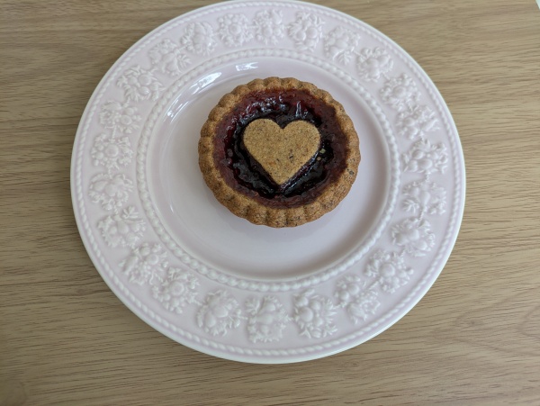 シナモンがきいた生地にラズベリージャムをのせたタルト。