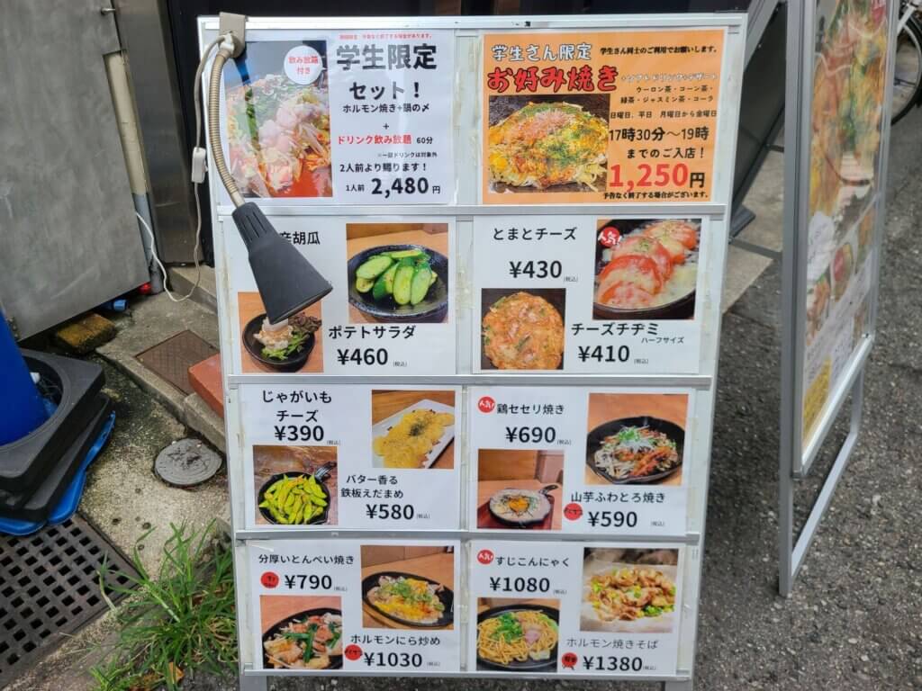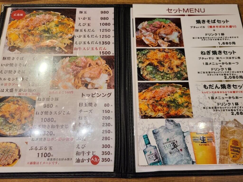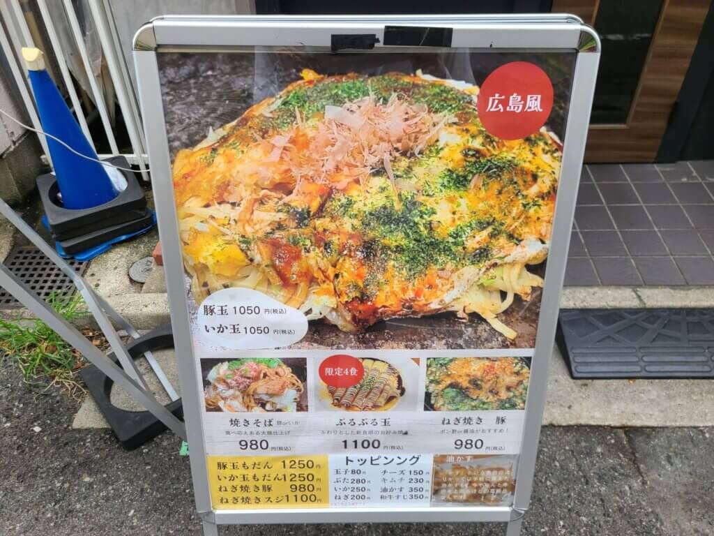 お店の前にはメニューも出ていました。この辺りではちょっと珍しい、キャベツのたっぷり入った、俗にいうところの「広島風」のお好み焼きが食べられるようです。これは楽しみ!