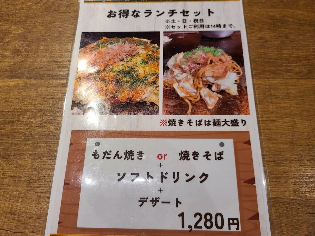 「鍋・鉄板酒場 あじと」さんは夜の営業がメインですが、土・日・祝日には「もだん焼き」か「焼きそば(麺大盛り)」にソフトドリンクとデザートが付いたお得なランチセットが用意されています。