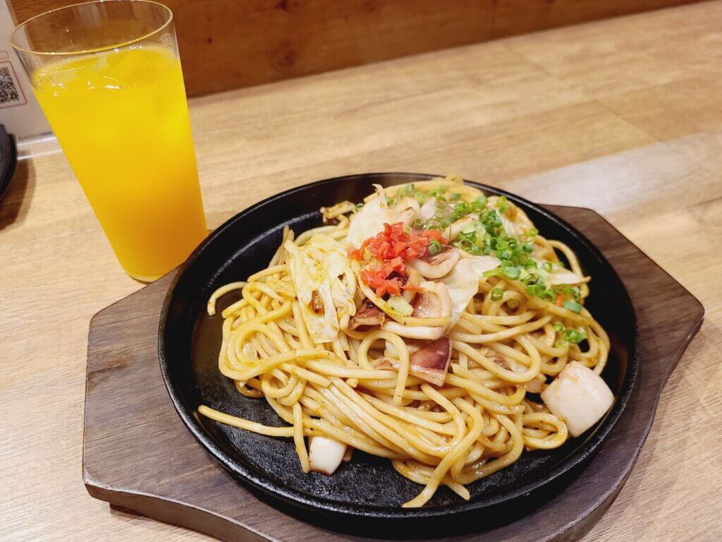 そしてこちらが「焼きそば」(イカ)のランチセット! ソフトドリンクはオレンジジュースを選びました。