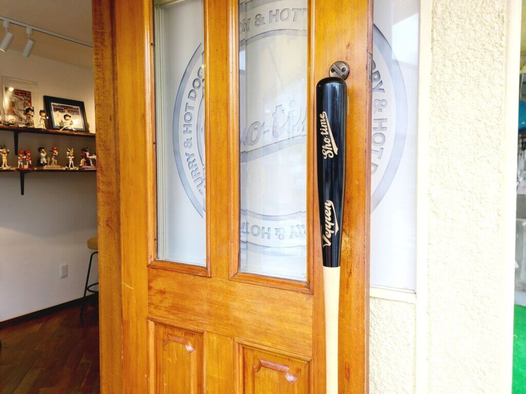 …って、お店のドアの取っ手がバット!! しかもちゃんとお店のロゴまで!