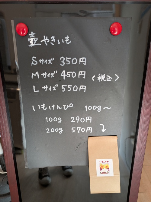 焼き芋はサイズで値段が決まっており、種類はシルクスイート、マロンゴールド、紅はるか、安納芋の4種類です。