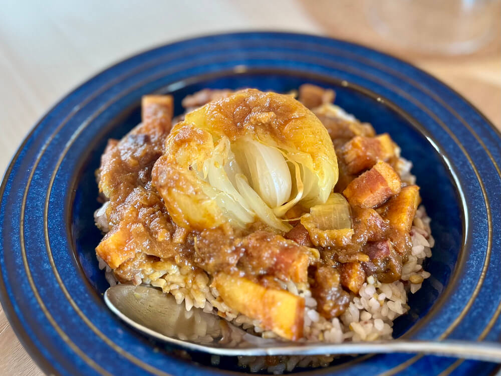 ルーの中央には、なんと丸ごとの玉ねぎが堂々と鎮座しています。