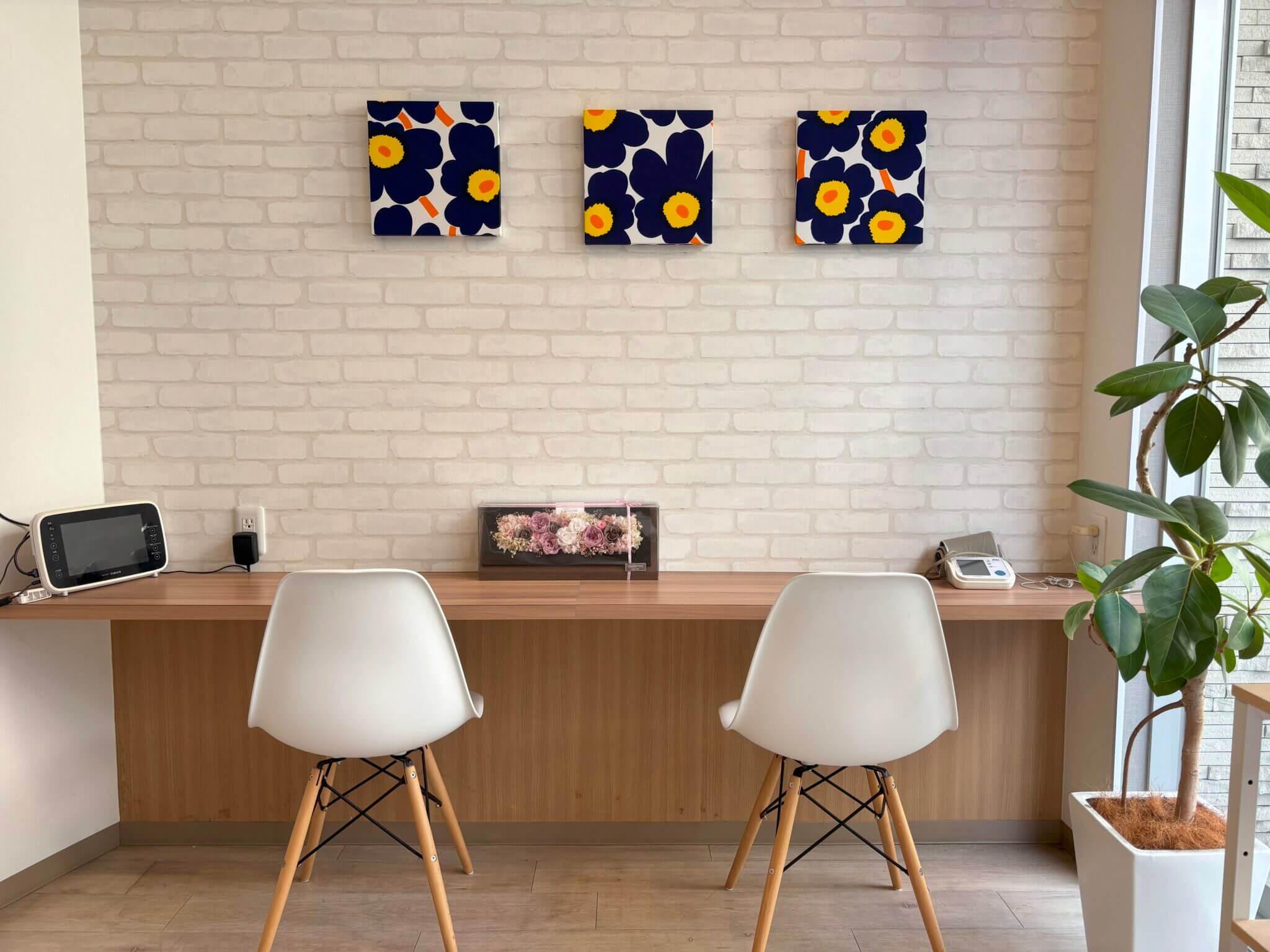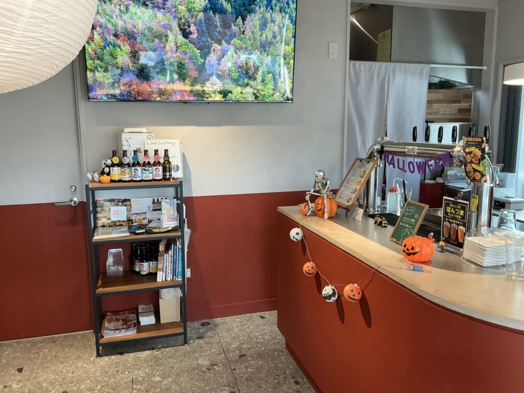 店内はおしゃれで落ち着いた空間に加え、カウンター席や4人掛けのテーブル席、そして小さなキッズスペースも完備。