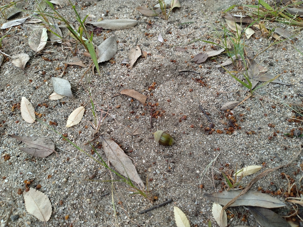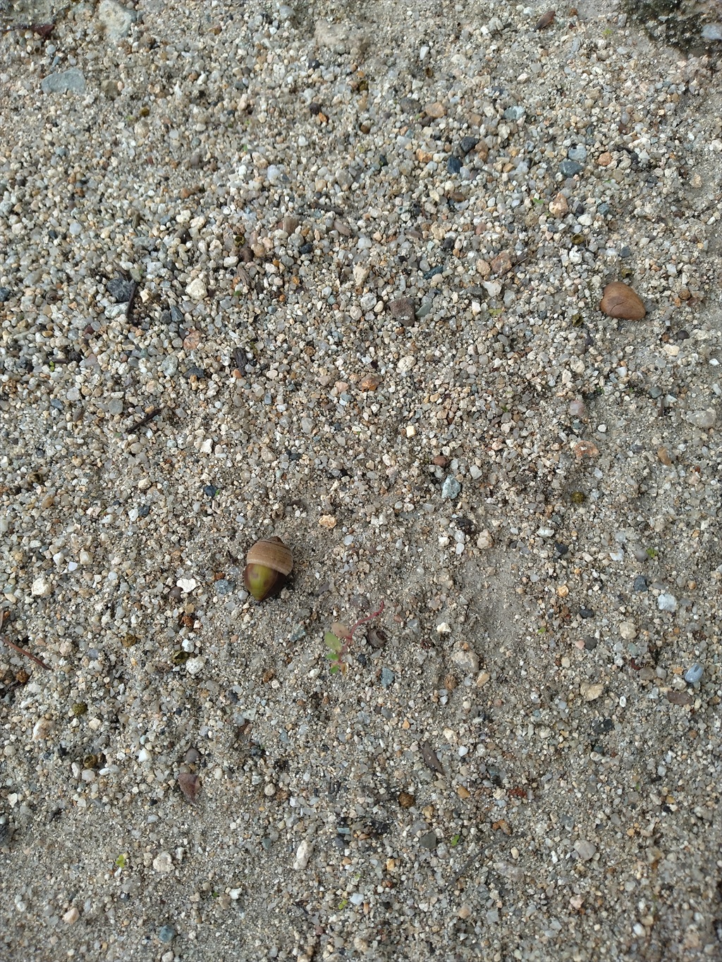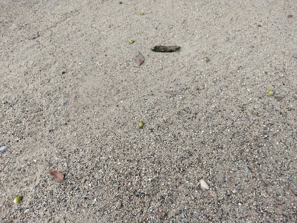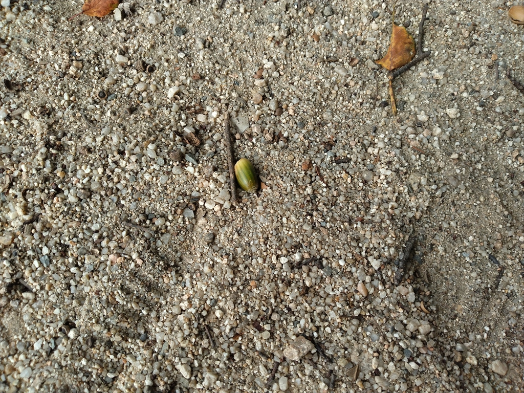 砂地の上に見える丸いシルエットは…本日のファーストどんぐりを発見。