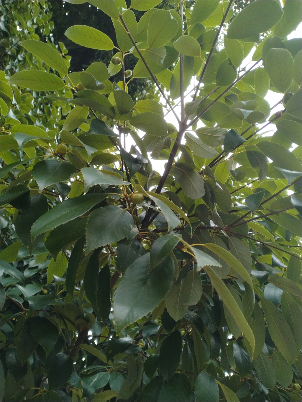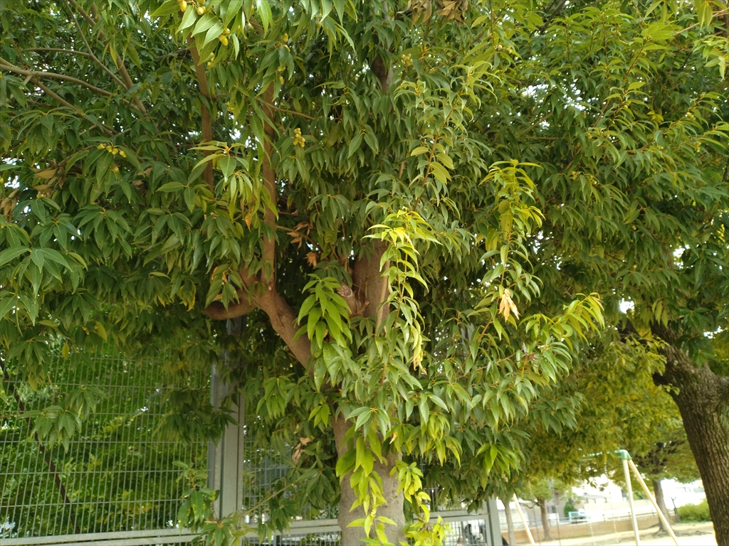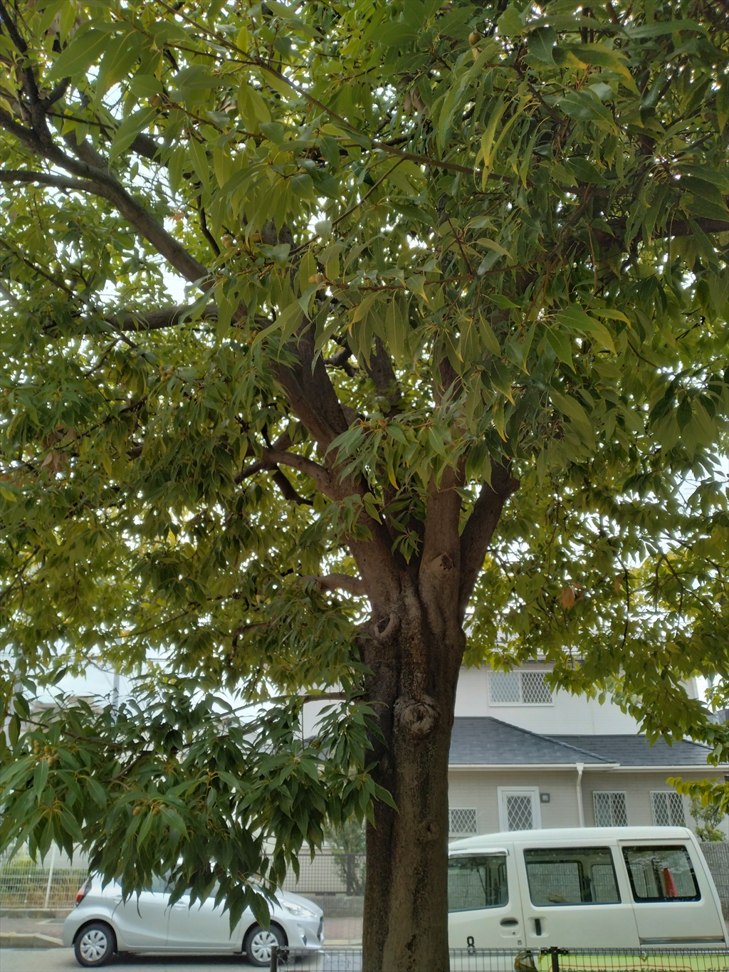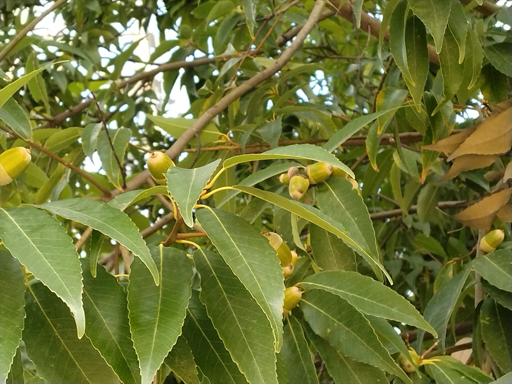 それでも、丹念に探し回るとやっぱりありましたね。寸詰まりなフォルムがかわいいこのどんぐりは種類不明。木はこんな感じでした。