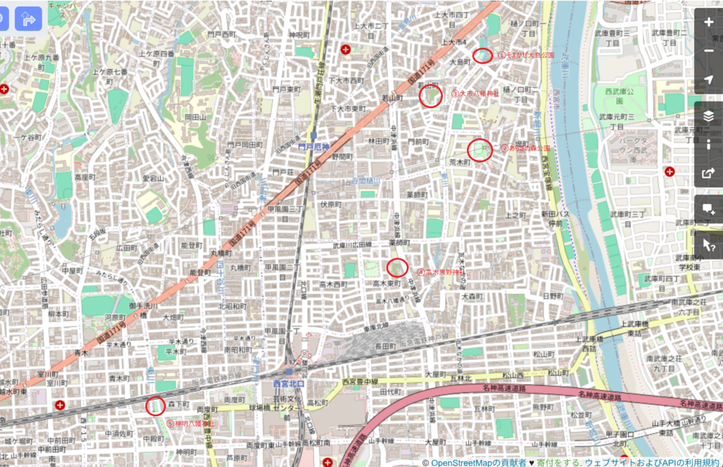 特にコースに理由はないのですが、①そよかぜ大島公園、②あらきの森公園、③大市八幡神社、④高木熊野神社、⑤神明八幡神社の順で回ってきました。