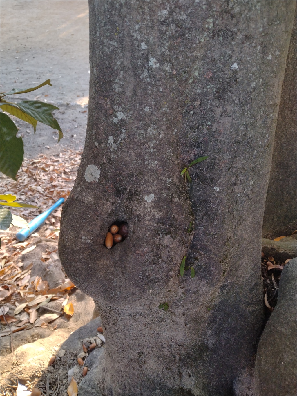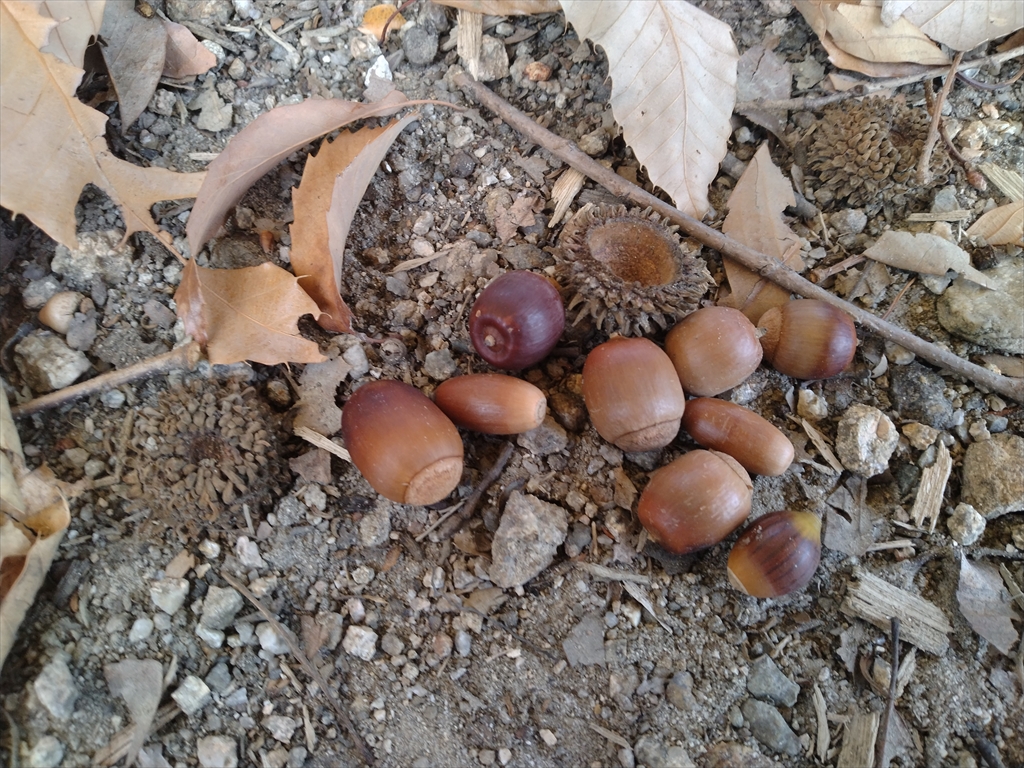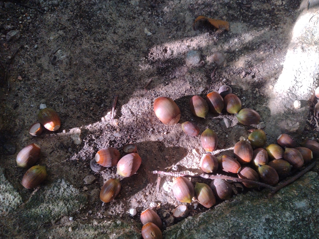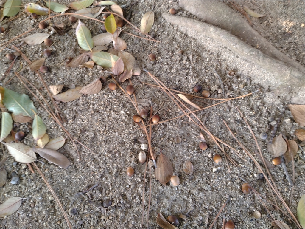 また、鳥居の近辺には細長いタイプのどんぐりも。マテバシイかな?