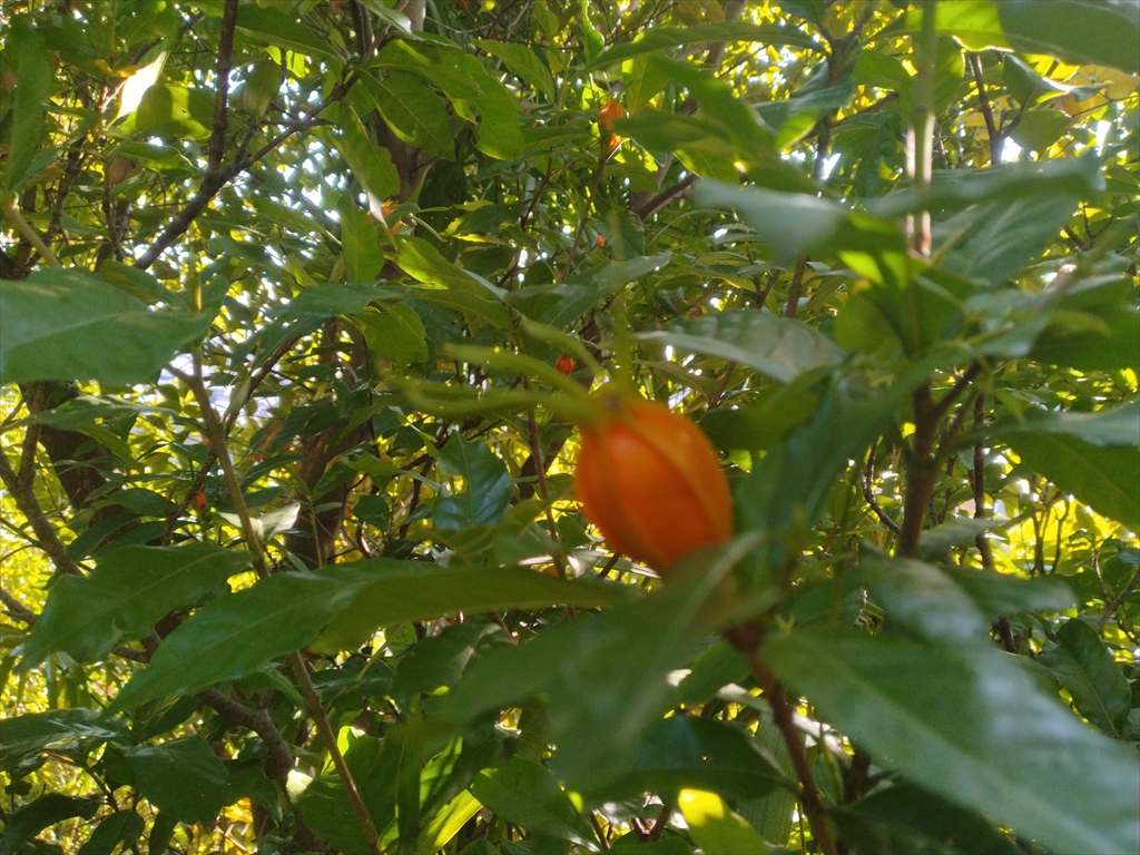 不思議な形状のオレンジの実がなっていました。後で調べたところ、食品の染料として使われるクチナシの実のようです。