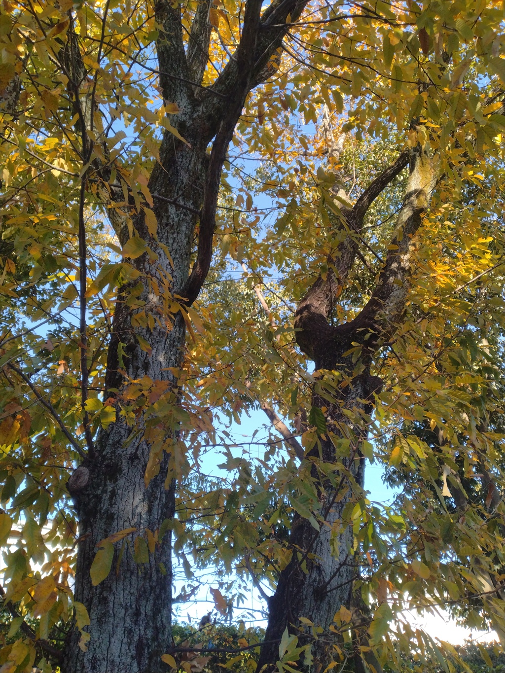 公園敷地の外側にある黄色く色づく木の下には、大きくて丸いどんぐりがいっぱい。アベマキ、クヌギのいずれかでしょうか?