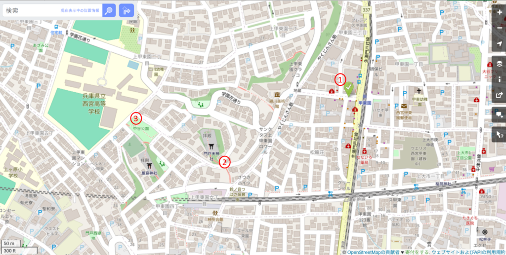 ①甲東園駅西口を出発し、②門戸天神社、③中谷公園を通って甲東園駅に戻ってきました。